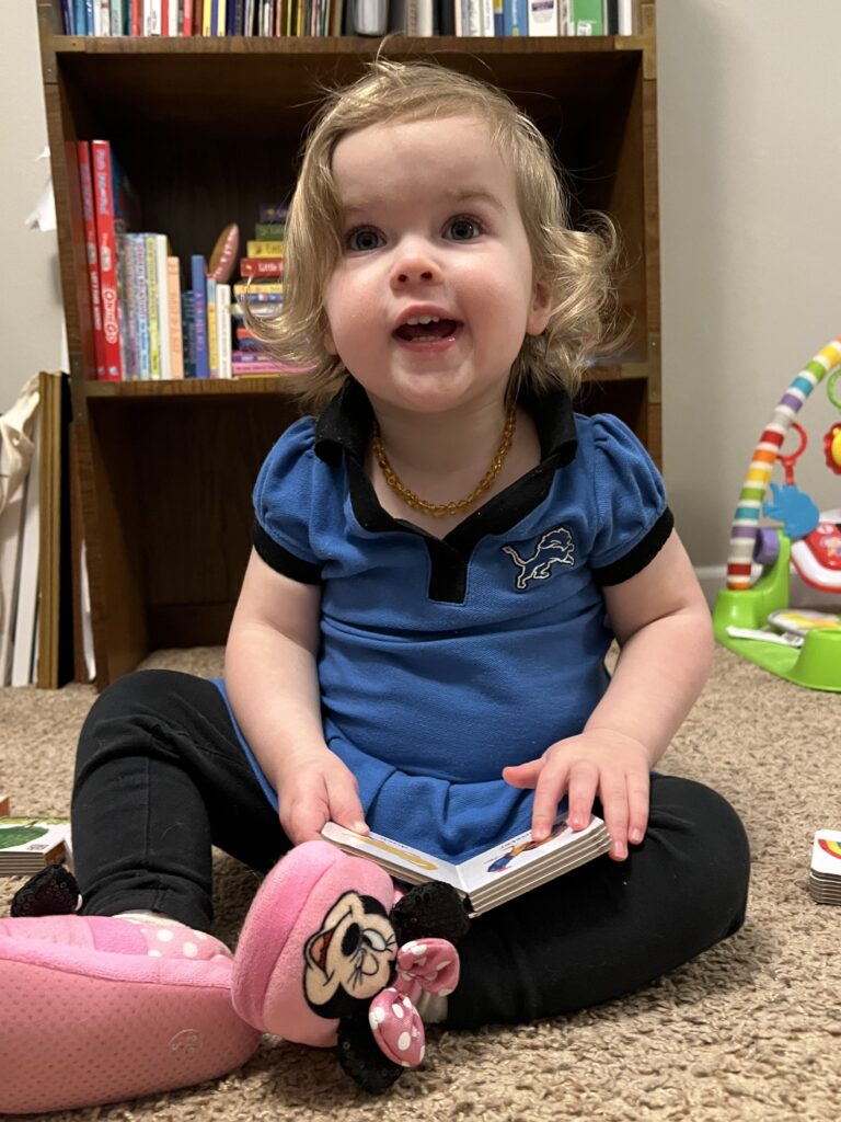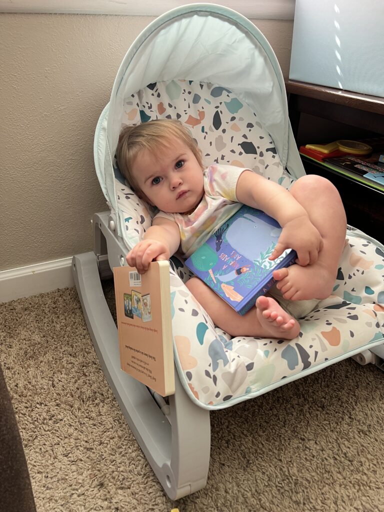 Maya at around 15 months old, holding two books in her chair and waiting for me to read one to her.