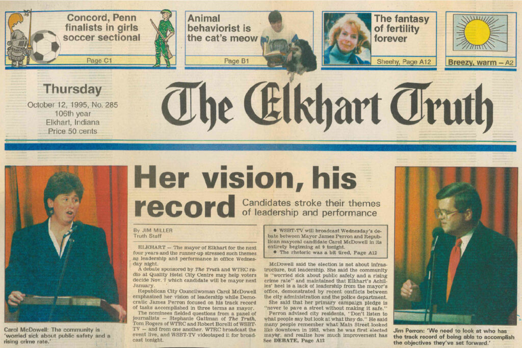 Perron, who notably was both the youngest person elected mayor in Elkhart’s history and also its longest serving mayor, lost his bid for a fifth term in 1999. His vote total was 20 percent less than the support he received in the ’95 election.