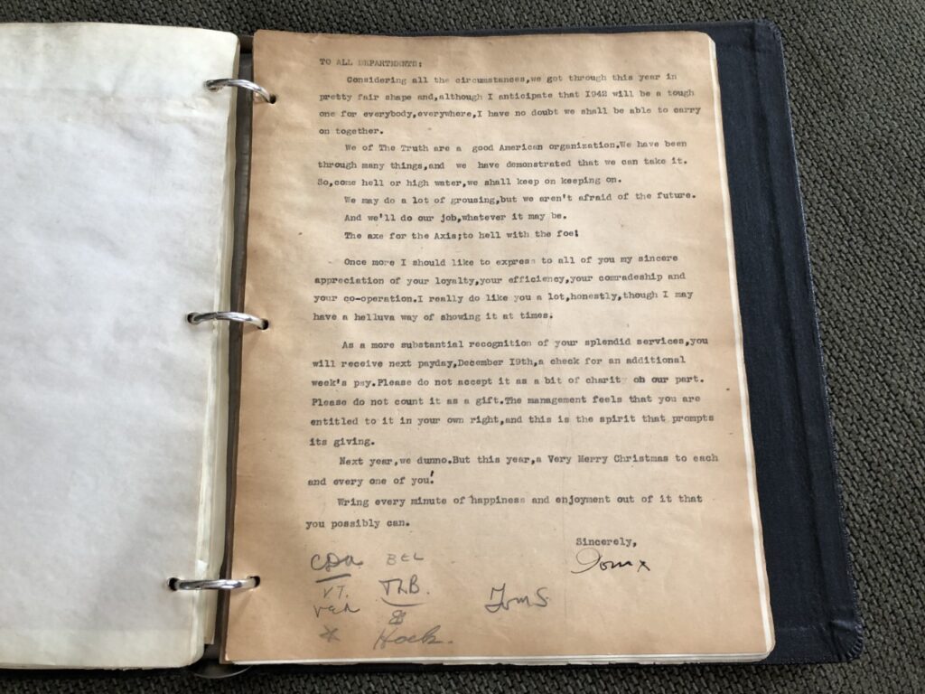 Bettie East’s name and home address appear on the front of the binder. How she came to possess the early memos before she started working for The Truth is unknown. What she must have thought of a particular December 1941 memo can only be guessed.
