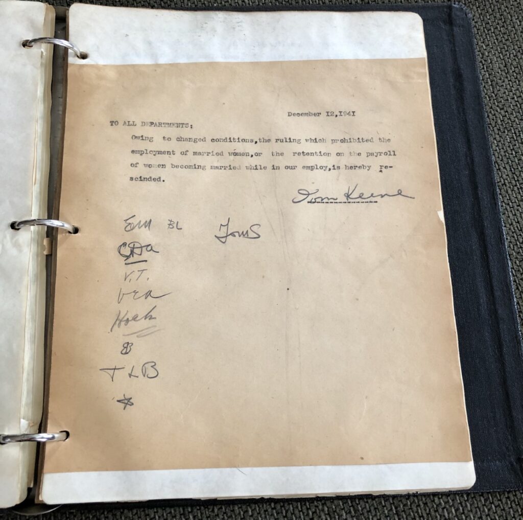 “TO ALL DEPARTMENTS:” started the memo that day from editor Tom Keene, “Owing to changed conditions, the ruling which prohibited the employment of married women, or the retention on payroll of women becoming married while in our employ, is hereby rescinded.”