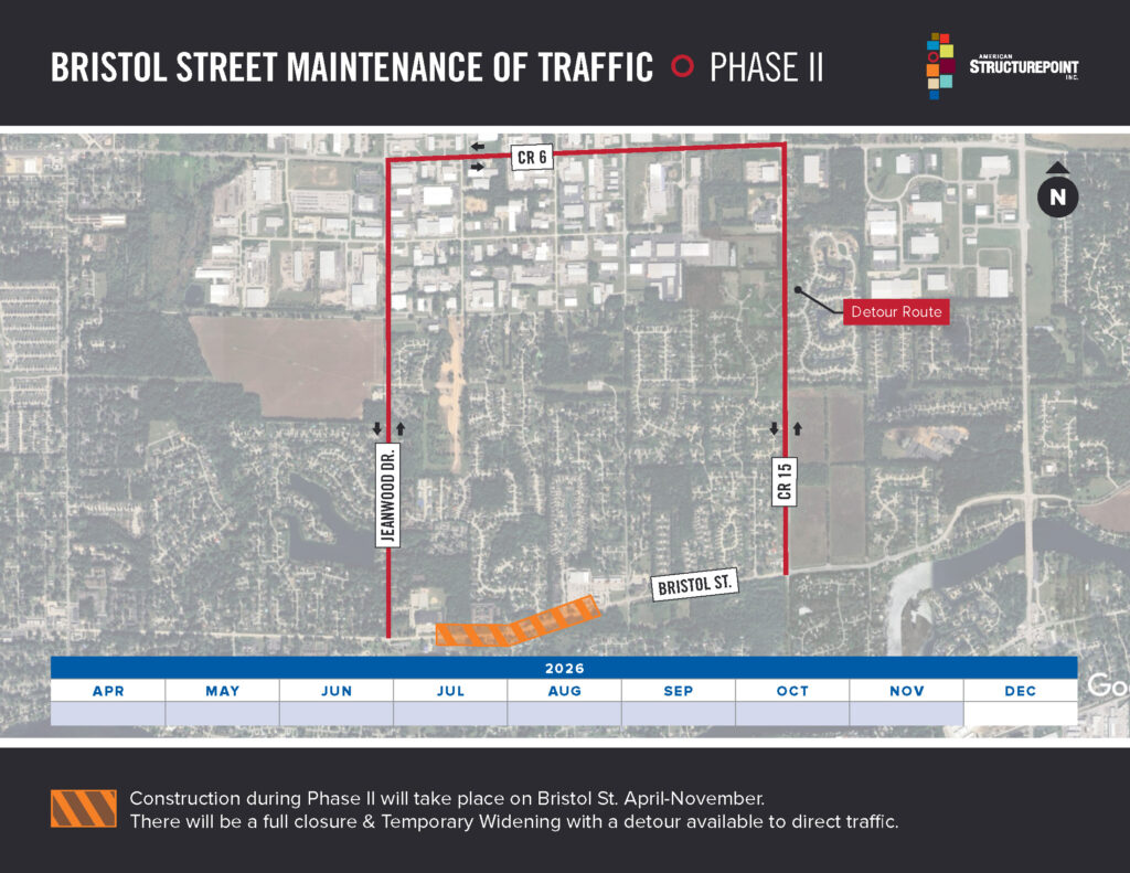 According to plans released by the city, from May until August, Bristol Street’s westbound lanes will remain open to traffic in a one-way direction past County Road 15 to Jeanwood Drive. From August until November, the eastbound lanes of Bristol Street will remain open to traffic in a one-way direction from Jeanwood Drive to County Road 15.