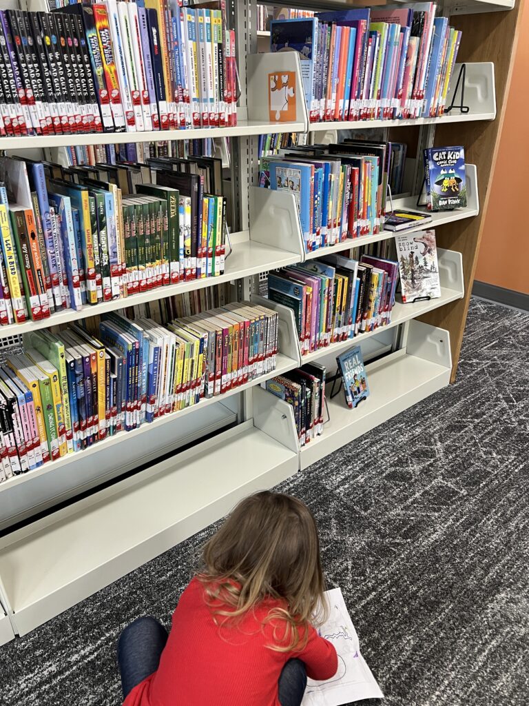 Maya spotted the blue roof of Dunlap branch as soon as we pulled into the parking lot on C.R. 13. When you walk in, book displays surround a gorgeous fireplace. It was lit on the chilly winter day of our visit. The vibes were very cozy!