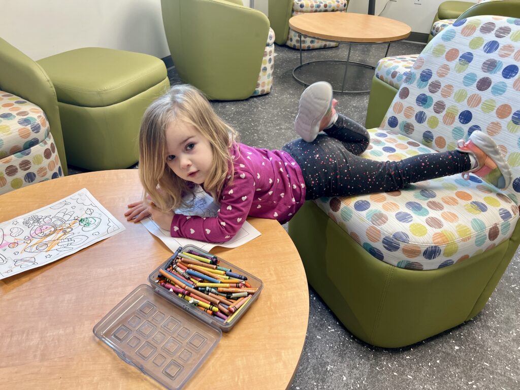 I heard a giggle nearby and followed the sound to a small meeting area near the children’s section. Maya lay half on a chair and half on a table, coloring gleefully. She had taken an entire crayon box from the children’s section and two coloring pages with her.