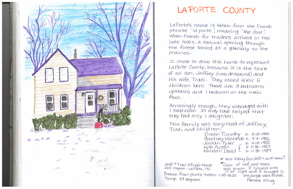 Like many amateur artists, there have been happy accidents. One of her first drawings was of her son’s home in LaPorte County. Since it was winter, she allowed herself to take a picture of the house, rather than draw it on site.