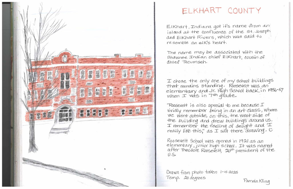 She started by sketching the Roosevelt Center. “It’s the only school still standing that I went to in Elkhart,” she says.