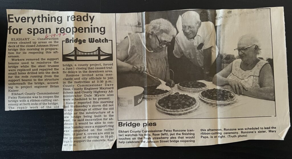 Unfazed by criticism, Patsy Ronzone carried the ball. At a meeting with officials from the Indiana Department of Transportation in February 1992, the commissioner declared people would drive across the new bridge by Dec. 31.